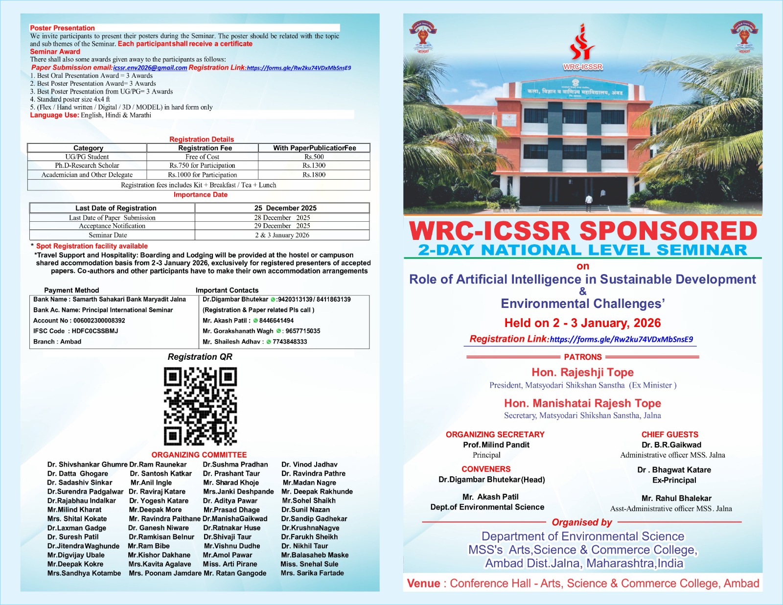For Paper Submission email: icssr.env2026@gmail.com Bank Details for Payment Bank Name : Samarth Sahakari Bank Maryadit Jalna Bank Ac. Name: Principal International Seminar Account No : 006002300008392 IFSC Code : HDFC0CSSBMJ Branch : Ambad